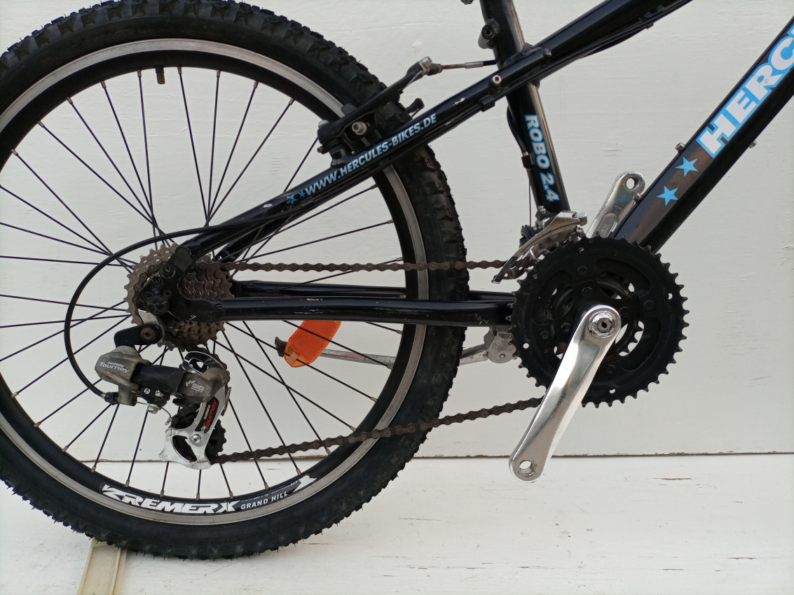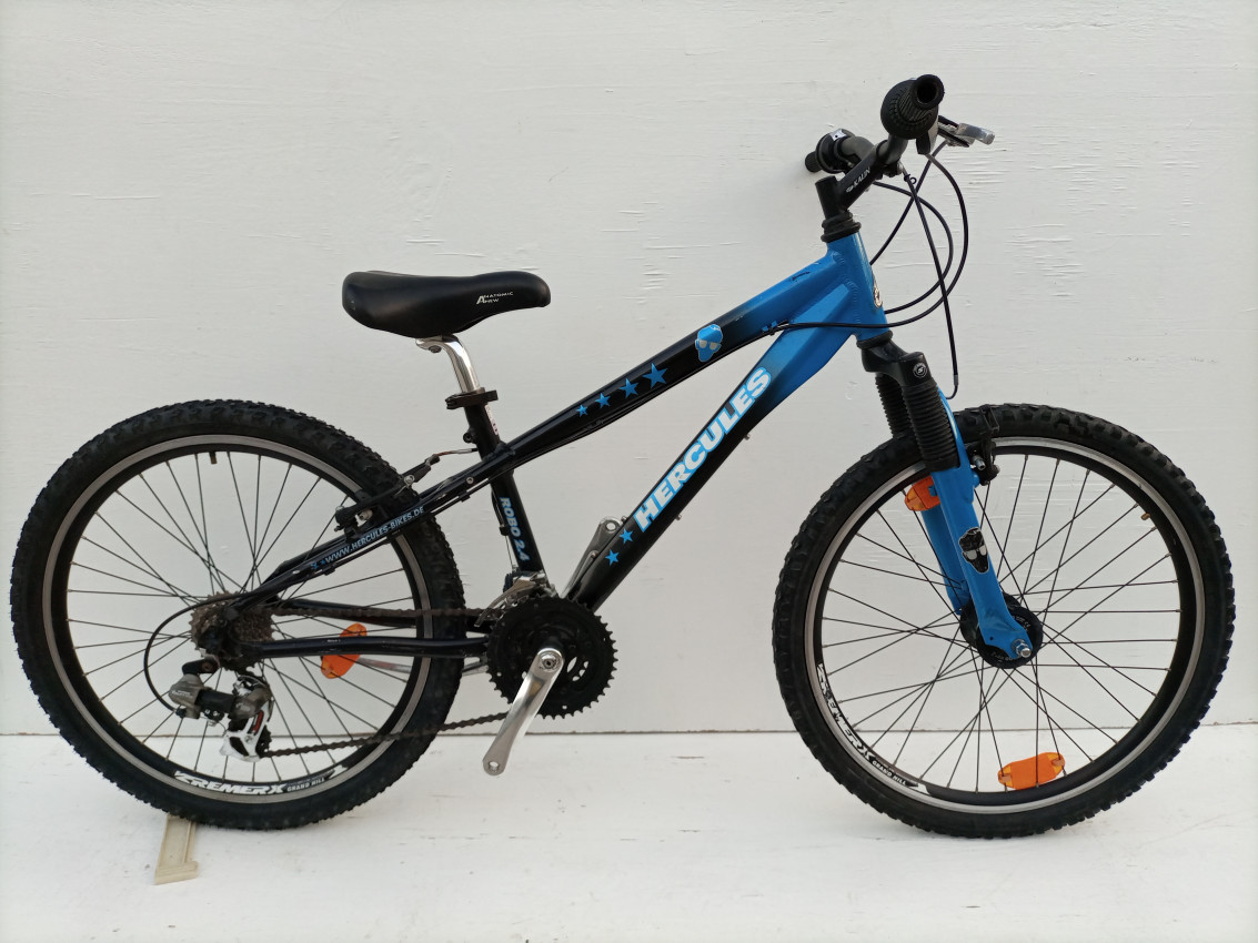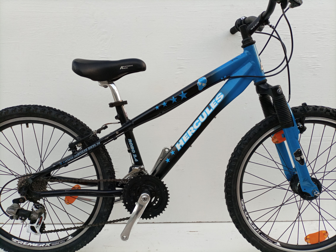 High quality used kids mountain bike. In perfect shape. Wheel size 24, Brand Hercules, frame material Alminium. Drive train geared with front suspension. Suitable for ages 9 -13 years.